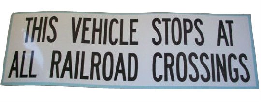 This Garman Decal product has a white background with black letters that says "THIS VEHICLE STOPS AT ALL RAILROAD CROSSINGS"