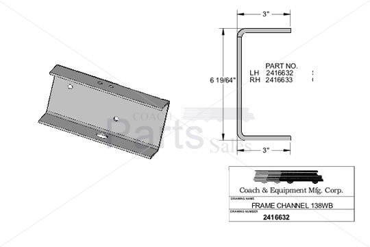 The right side channel is a bus part manufactured and fabricated by Coach and Equipment. The right side channel fits the rear bumper and allows for an extension of the bus frame.Channel wheel base: 138 in Coach and Equipment Part Number:# 2416633